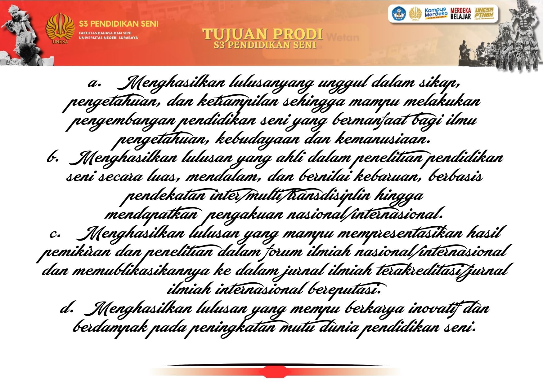d. Creating graduates who excel in attitude, knowledge, and skills so that they are able to develop art education that is beneficial for science and humanity.