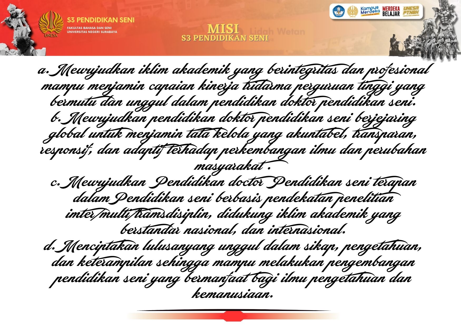 Developing art education and research with a multi/transdisciplinary approach based on the arts and culture of the archipelago to produce graduates who are superior, adaptive, innovative and able to develop entrepreneurship that has an impact on art education.
